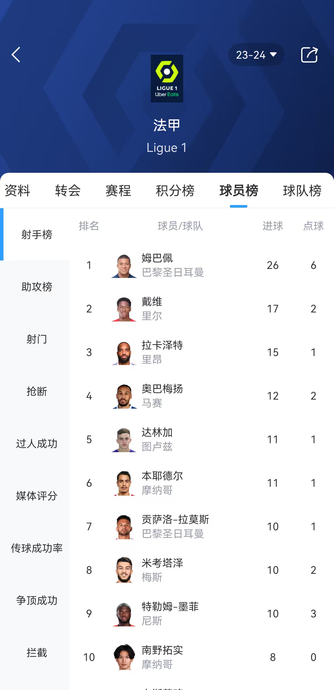 法甲射手榜↓